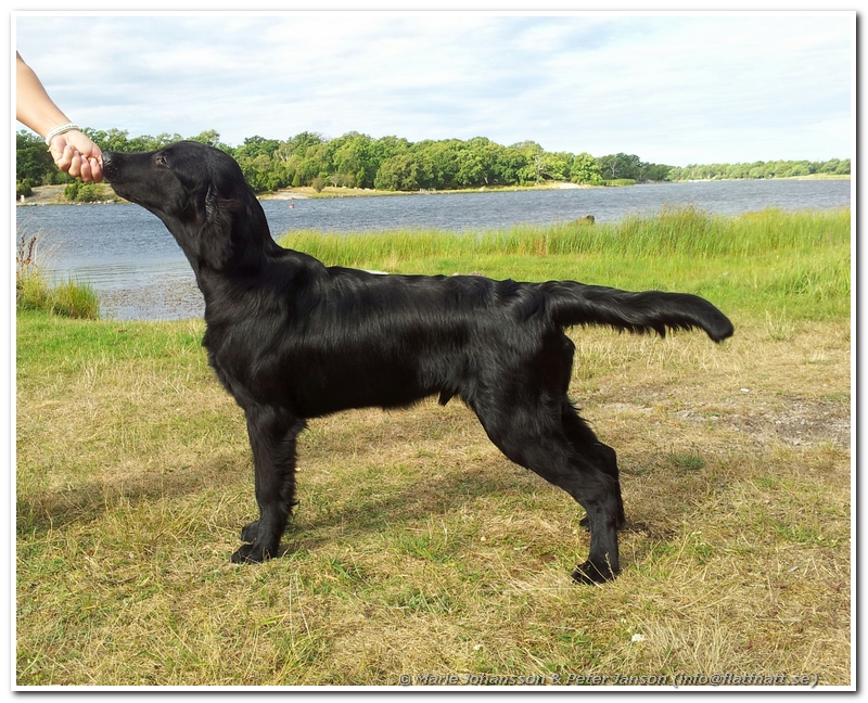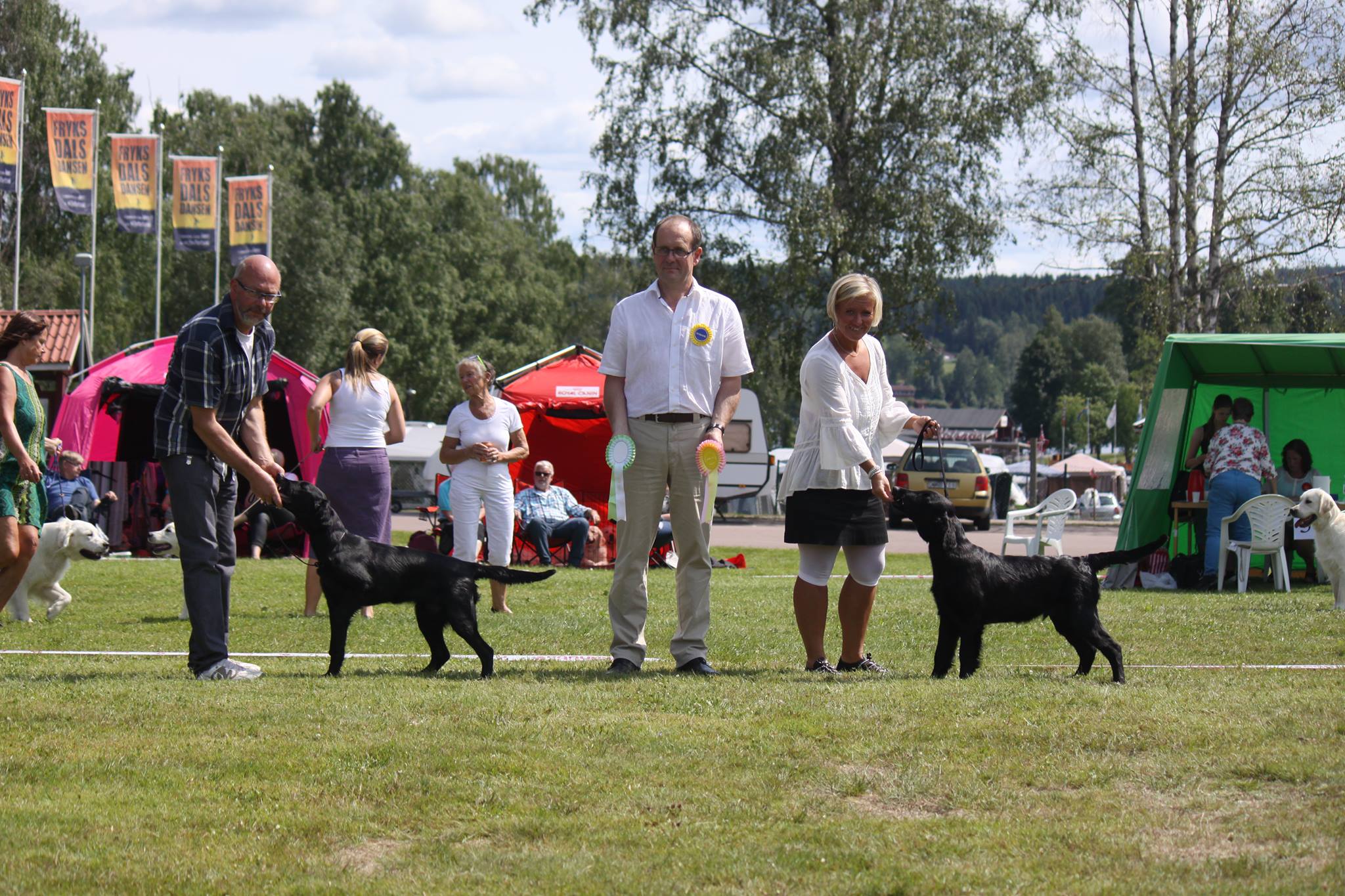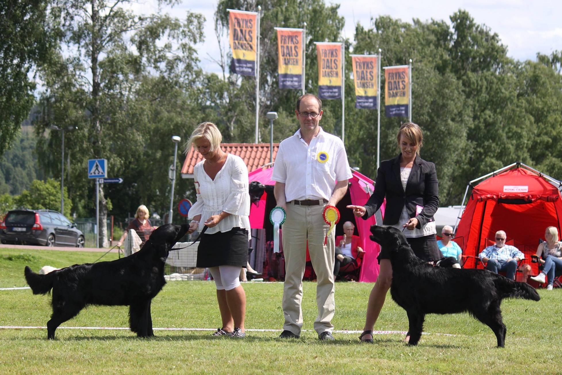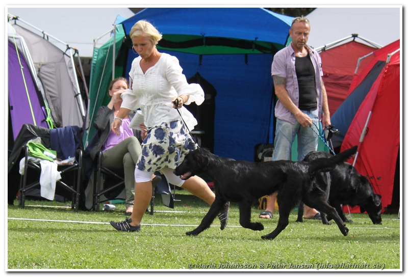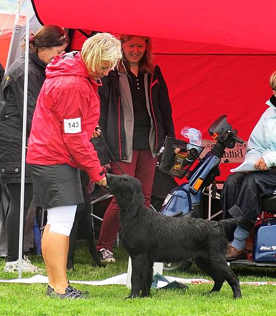 Det blev tunnare och tunnare med både tält och folk men till slut ropades det i högtalarna att det var dags för valparna att förhandsbedömmas. Raskt dit för att genomgå domare Rita McCarry-Beatties grundliga undersökning. Imponerande att ta sig den tiden när man har 27 valpar att förhandsgranska. Väl inne i ringen plockade domare först ut 6 hundar som hon vill titta lite närmare på. Devil var kvar bland dessa vilket var riktigt kul. Efter att alla hundar fått röra sig tackade domaren av 2 hundar, hunden framför respektive bakom Devil så det var lite nervöst men han var fortfarande kvar med 4 hundar kvar att placera. Sen annonserades det att på fjärde plats ville domaren se en Flatcoated Retriever på det blev en imponerande BIS-4 av 27 valpar. Dessutom fick vi lovord av domare som tyckte att han var superfin. 🙂