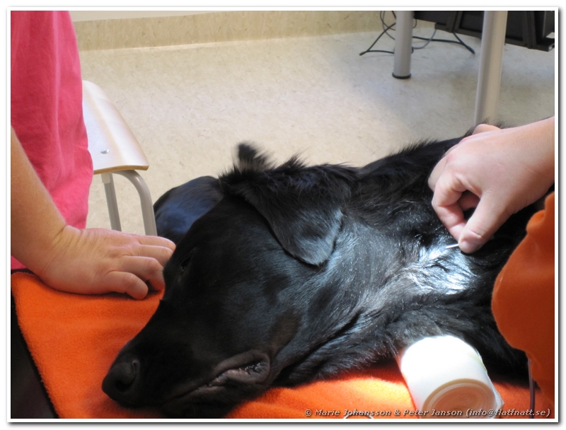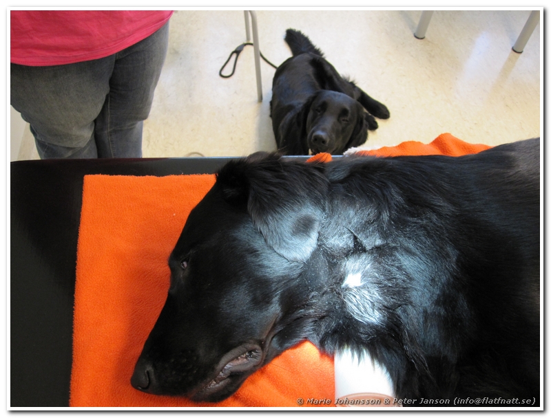 Sen när undersökningen av blodet visade att allt var bra och veterinären undersökt honom fick han lite lugnande. Lite underligt att en hund som är så livlig i vanliga fall blir totalt däckad med en gång av lugnande. 🙂