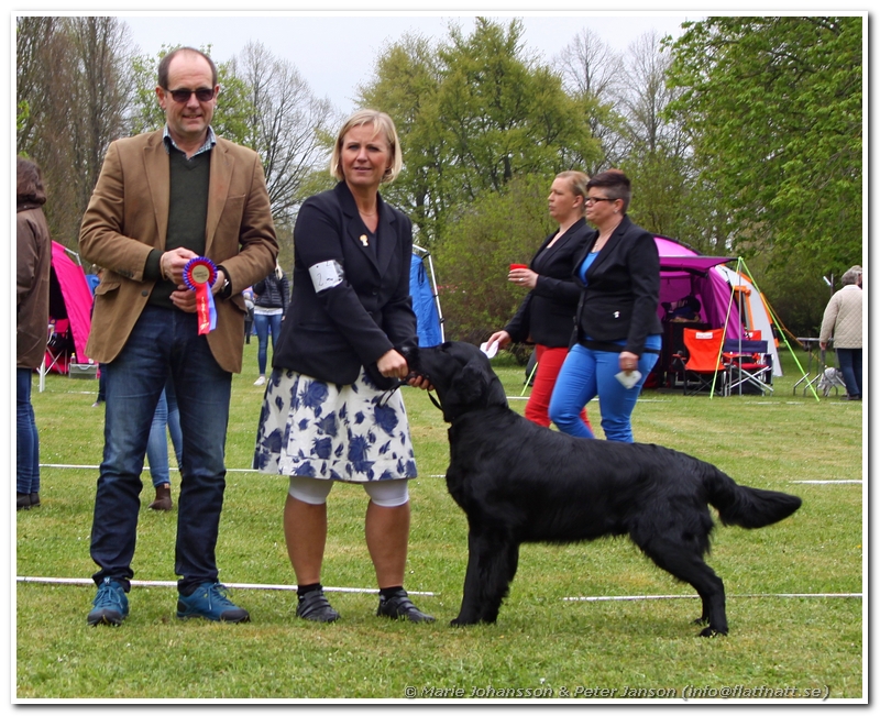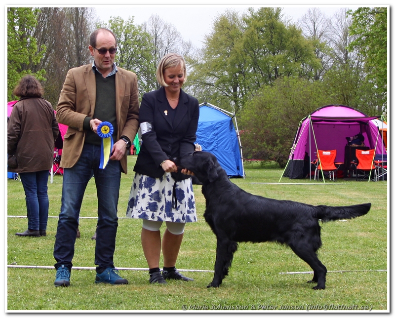 Devil var därför först ut i ringen redan klockan 08.30 och inte långt senare hade han vunnit klassen med CK. Sen fick vi vänta en stund innan det blev dags för Neo att gå in i ringen. Liksom igår blev det en andraplats i såväl klassen som i bästa hane. Devil blev dock oplacerad idag. Neo blev även idag bästa jaktmeriterade flatcoat i rasringen. För våran uppfödargrupp blev det idag en andraplats i rasringen.