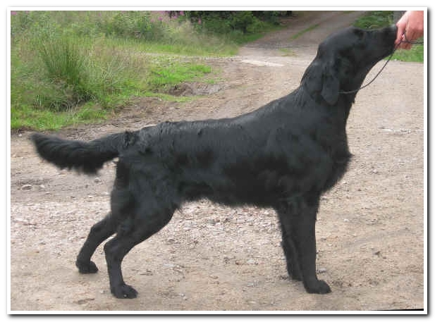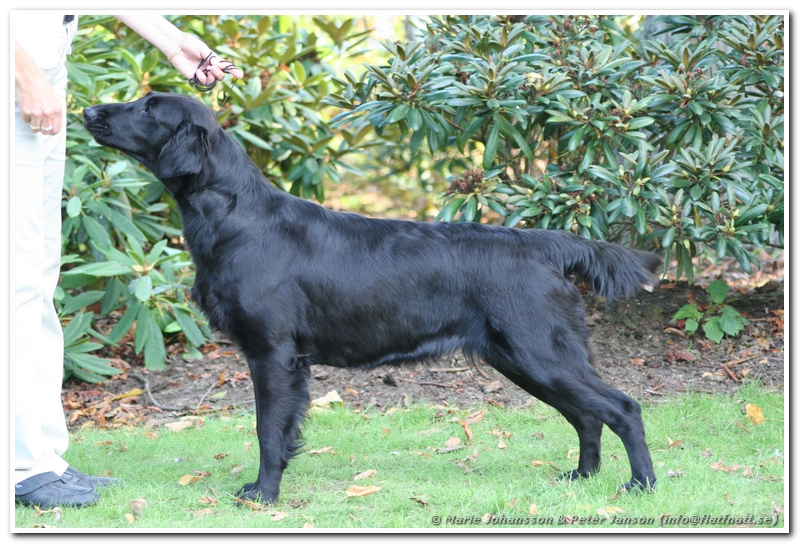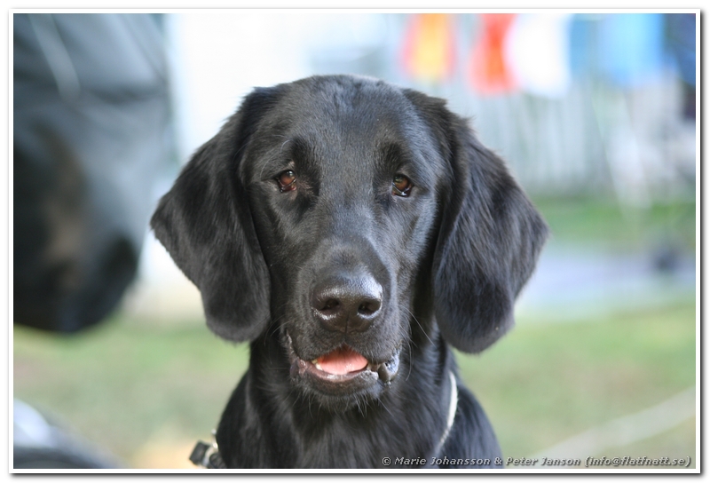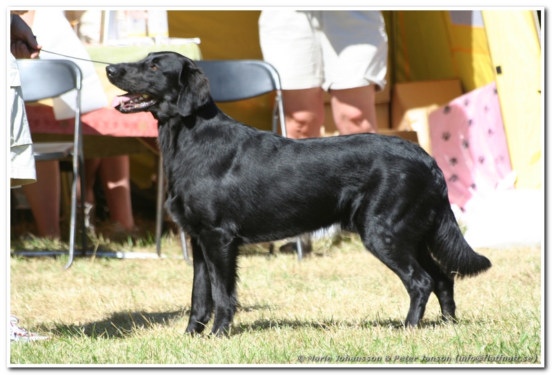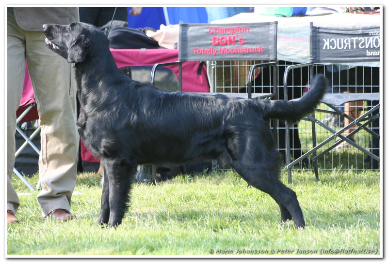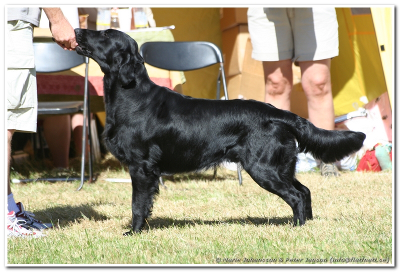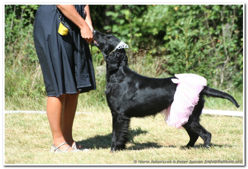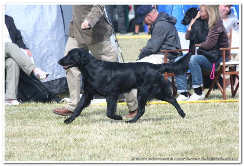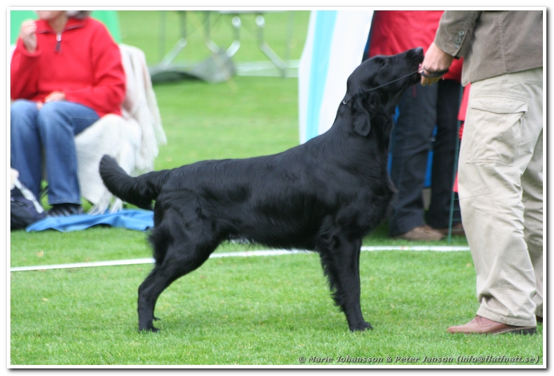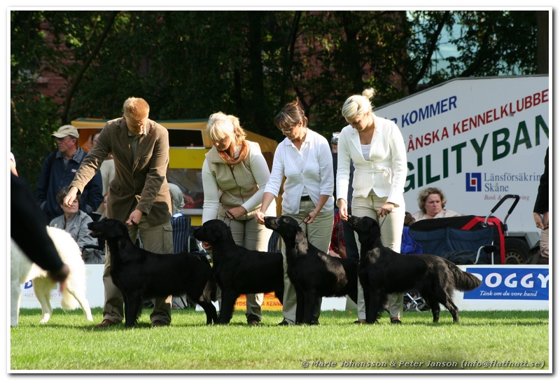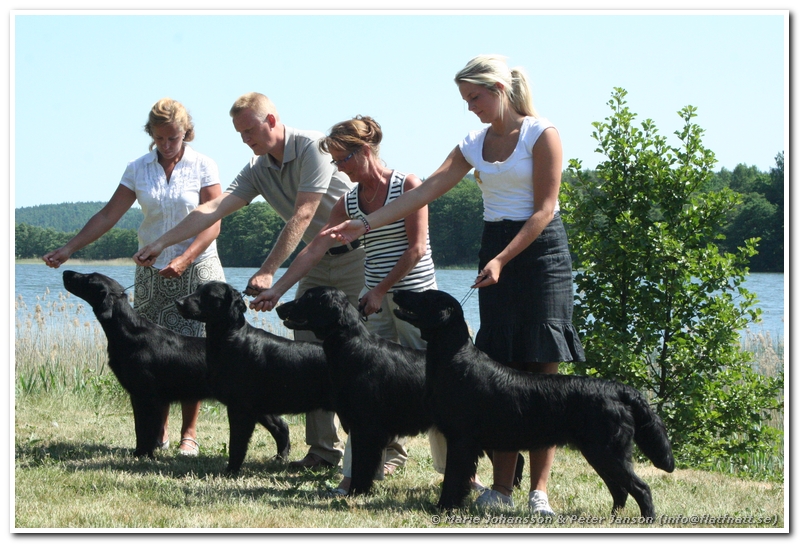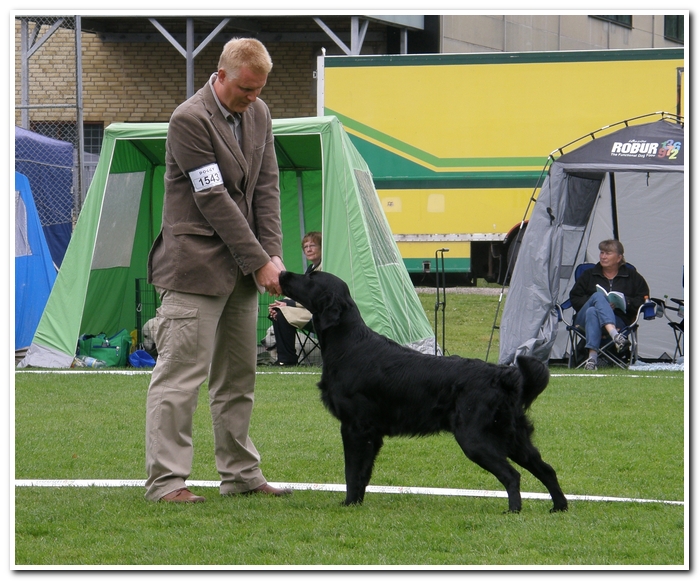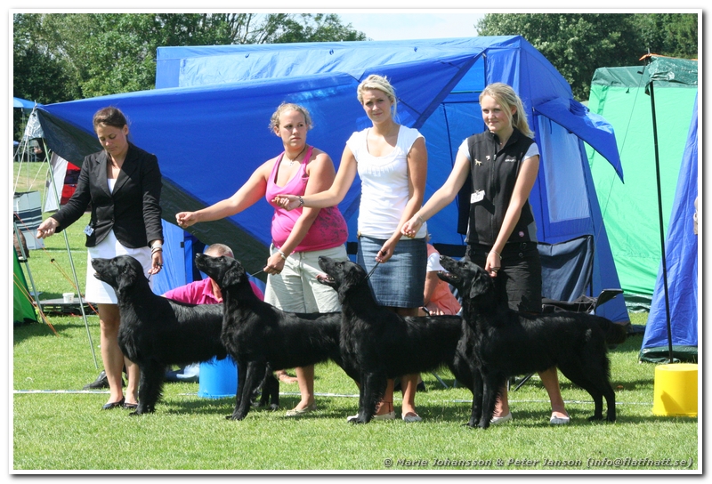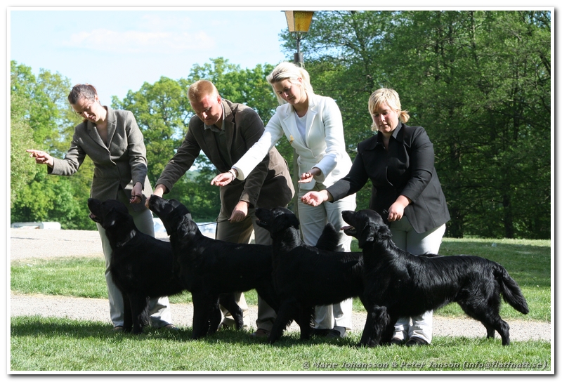 Vi hade också bestämt oss för att sätta ihop en uppfödargrupp för Anneli. Valet var ganska enkelt. Det blev Zigge (bästa hane med CERT), Pepsi (3:e bästa hane), Neo (5:e bästa hane) och Tara (4:e bästa tik). Efter en del trixande var det dags för att tävla i ringen med gruppen. Ytterligare en flat-grupp ställde upp. Efter lite springande och uppställande av båda grupperna förkunnade ringsekreteraren att båda grupperna fått HP och att bästa flat-grupp var gruppen från Flatterhaft. Yippie!!!! Vi fick också tips från domaren hur vi skulle ställa hundarna för att se som bäst ut. *Asgarv* Kändes nästan som hon ville vi skulle vinna BIS-gruppen. När vi sedan läste att det var just vår domare som skulle döma gruppen blev det ytterligare lite fniss.