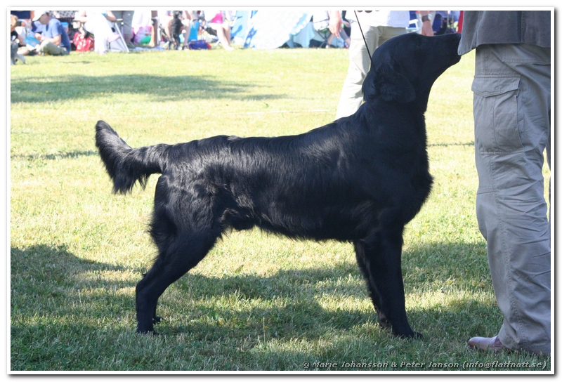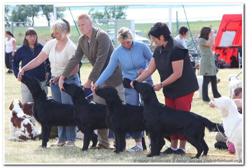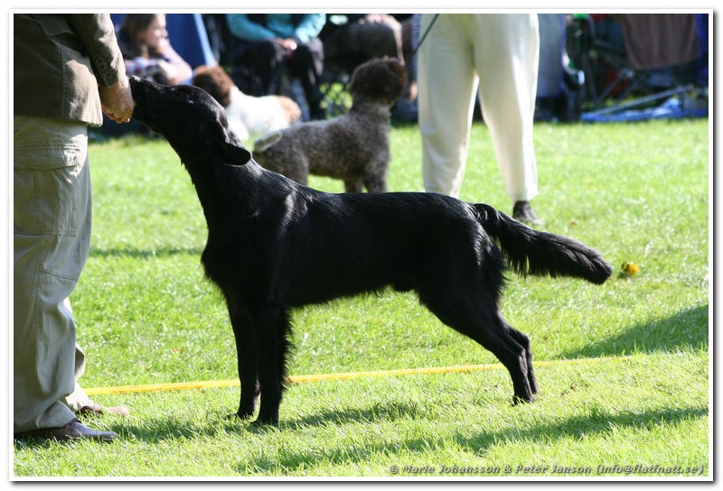 att vinnande grupp inte behövde se allt i svart denna dag varpå stora jublet bröt ut när hon meddelade att dagens BIS-grupp var en grupp med Flatcoated Retriever från kennel Flatterhaft!!!!!!!
