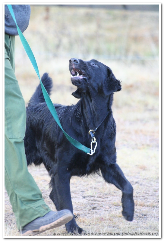 Vi startade klockan 11 med Neos vardagslydnad där vi började i paddocken med koppelträning som vanligt. Detta börjar funka riktigt bra för de flesta nu så vi behövde inte nöta det så mycket idag utan kunde hyffsat raskt hoppa till nästa moment vilket var ”hundmöte”. Denna övning går helt enkelt ut på att man går mot varandra och hundarna skall gå så nära varandra som möjligt utan att göra några utfall eller visa aggression över huvudtaget. Mycket nyttig övning som man har nytta av vid sina dagliga promenader. Skönt att man kan lite på sin hund och vet att den inte gör utfall mot andra hundar. Detta nötte vi däremot rätt länge idag för det är några hundar i gruppen som behöver enna träning. När väl alla klarade av detta utan problem gjorde vi varsin inkallning innan vi gick upp till skogen för att köra den numera klassiska övningen ”Peter i skogen”. Övningen går till så att varje hund släpps lös i skogen där Peter befinner sig (ibland med och ibland utan hund). Så snart hunden möter Peter skall hundägaren på hans kommando kalla in sin hund som då skall springa till husse/matte. Övningen är i stort sett en inkallning fast med lite fler störningsmoment. Alla hundarna klarade denna övning galant trots många ägeras oroliga uppsyn. Den enda hund som vågade sig hela vägen fram till Peter och Torkel var kanske inte helt oväntat Neo. Men det vore väl nästan konstigt om han inte kom fram. Men till slut vände han dock och sprang tillbaka till matte på hennes inkallning. |