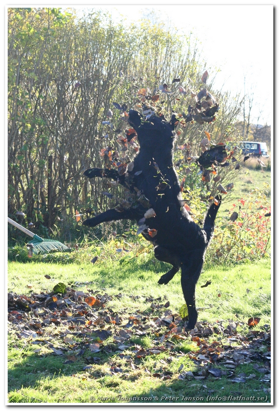 Idag var vi ute i trädgården och höststädade lite. Eller nåja, vi försökte i alla fall. Att kratta löv med två flattar visade sig var lite lurigt. Speciellt Neo ville jaga alla löv och pinnar vi försökta kratta ihop.